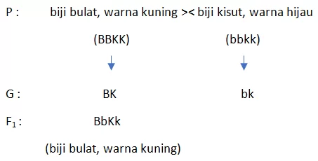 Pada persilangan tanaman kacang polong biji bulat berwarna kuning (BBKK) dan kacang polong biji kisut berwarna hijau (bbkk).
