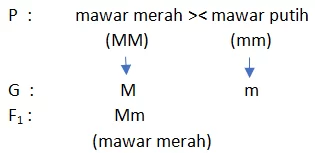 Perbandingan untuk fenotip dari F2 = mawar merah: mawar merah: mawar merah = 3 : 1