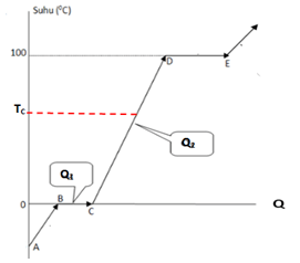 Posisi Es karena padat berada pada posisi B sedangkan Air berada pada posisi C akibatnya untuk menempuh ke posisi Tc, Es menempuh Q1 dan Q2 sedangkan air Q2 saja. Dengan demikian: